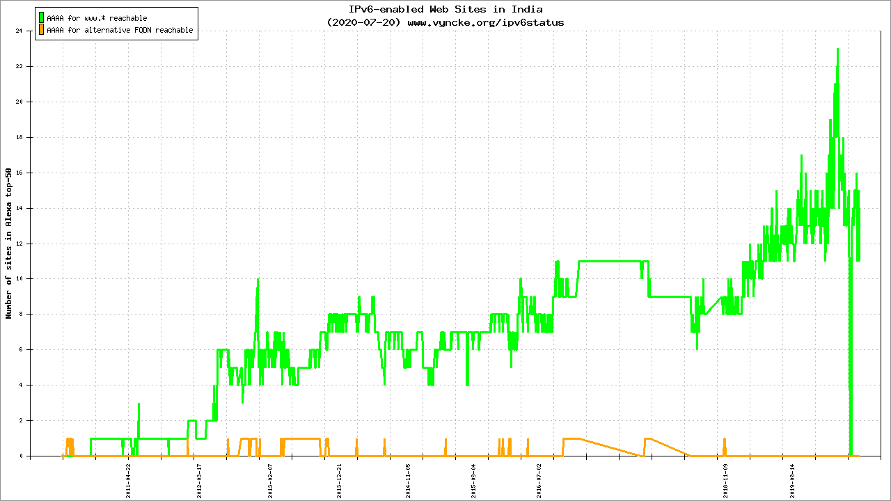 印度從2012年中期到2018年中期支持IPv6的網(wǎng)站數(shù)量整體都是10個(gè)以下,從2018年中期開(kāi)始網(wǎng)站開(kāi)啟IPv6的數(shù)量開(kāi)始逐漸增加,最高時(shí)達(dá)到了23個(gè),目前維持在15個(gè)上下(圖6)。