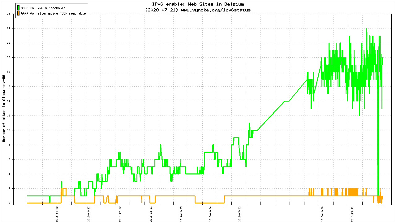 圖3 比利時(shí)TOP 50網(wǎng)站IPv6支持?jǐn)?shù)量趨勢(shì)