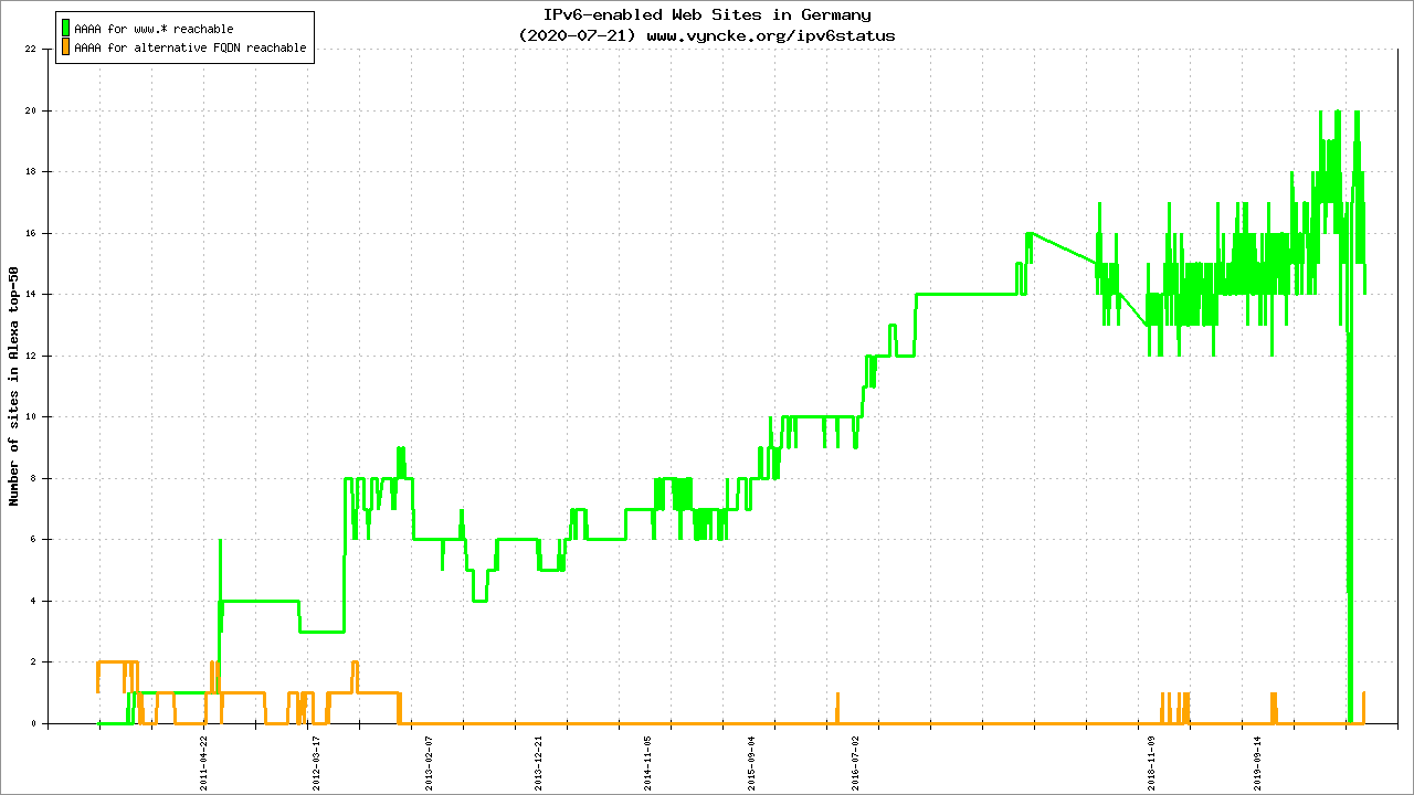 德國(guó)從2012年中期到2015年底支持IPv6的網(wǎng)站數(shù)量一直在10個(gè)以下。從2016年7月開(kāi)始有了明顯的上升,至今維持在了16個(gè)左右,最高時(shí)達(dá)到了20個(gè)(圖4)。