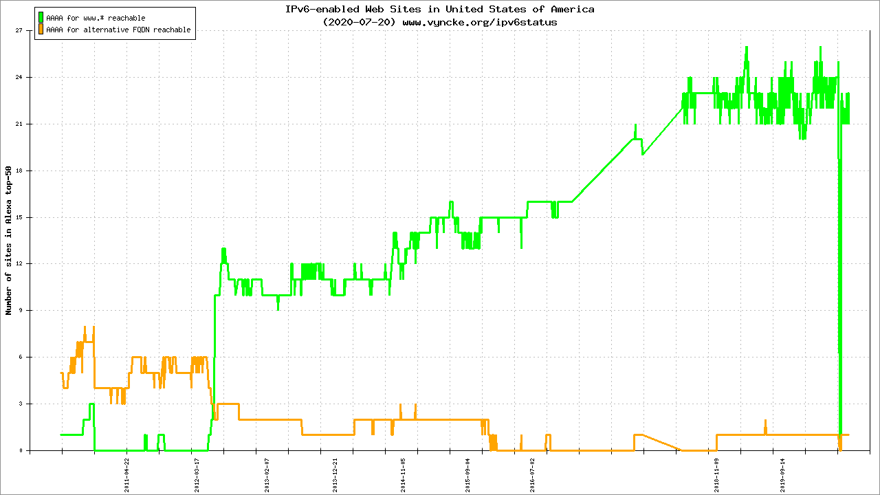 美國(guó)從2012年中期開(kāi)始支持IPv6的網(wǎng)站數(shù)量從0升至10個(gè),并在兩年內(nèi)一直保持在9-12個(gè),之后在14年底到16年底的時(shí)間內(nèi)穩(wěn)定保持在了12-15個(gè),從18年中期開(kāi)始支持IPv6的網(wǎng)站數(shù)量上升至20+,并一直穩(wěn)定在21-24個(gè)上下,最高時(shí)期達(dá)到了26個(gè)(圖8)。