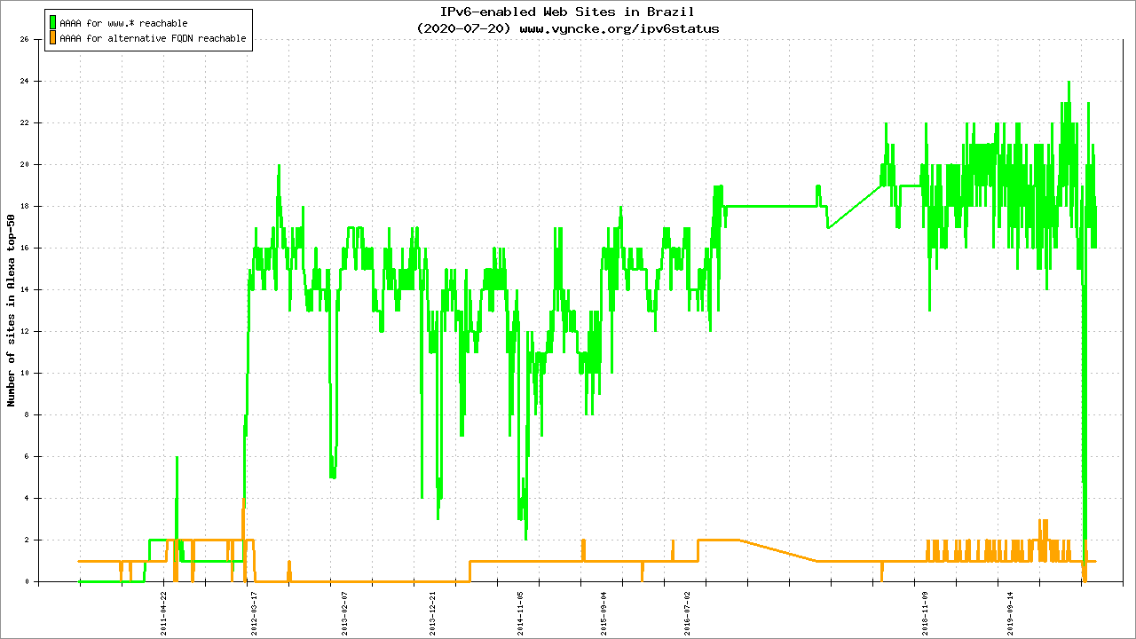圖7 巴西TOP 50網(wǎng)站IPv6支持?jǐn)?shù)量趨勢(shì)
