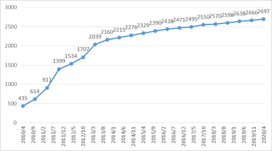 據(jù)全球IPv6論壇IPv6 Enabled WWW Logo認(rèn)證項(xiàng)目統(tǒng)計(jì),截止到2020年6月,全球已有2697個(gè)網(wǎng)站通過(guò)IPv6 Enabled WWW Logo測(cè)試并獲得認(rèn)證。以下是IPv6 Enabled WWW Logo項(xiàng)目提供的累年總體統(tǒng)計(jì)數(shù)據(jù),如圖9。IPv6 Enabled認(rèn)證的網(wǎng)站按國(guó)家/地區(qū)分布統(tǒng)計(jì)如圖10,IPv6 Enabled Logo按網(wǎng)站類型統(tǒng)計(jì)如圖11。