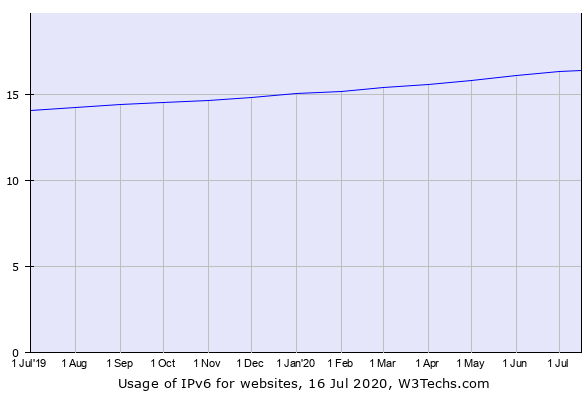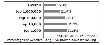 根據(jù)W3Techs的數(shù)據(jù)顯示,截止到2020年7月16日,全球所有網(wǎng)站中有16.4%的網(wǎng)站支持IPv6訪問(wèn),比去年提高了1.8%。排名前100萬(wàn)的網(wǎng)站中有21.9%的網(wǎng)站支持IPv6訪問(wèn),比去年提高了2.7%。排名前10000的網(wǎng)站IPv6支持率31.3%,比去年提高了3.6%(圖1~圖2)。