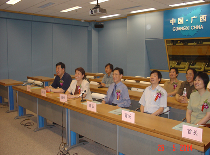 廣西分會(huì)場(chǎng)的領(lǐng)導(dǎo)正在通過(guò)視頻會(huì)議系統(tǒng)與上海主會(huì)場(chǎng)交流意見