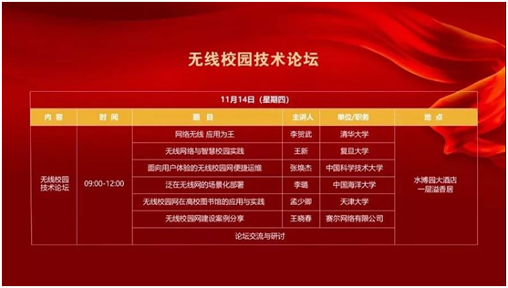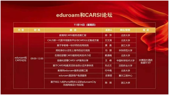 11月14日是CERNET第二十六屆學(xué)術(shù)年會(huì)的最后一天,除大會(huì)閉幕式外,上午還將有三場(chǎng)技術(shù)論壇——無(wú)線校園技術(shù)論壇、eduroam和CARSI論壇、云計(jì)算服務(wù)技術(shù)論壇舉行(詳細(xì)議程請(qǐng)見(jiàn)下圖),敬請(qǐng)大家繼續(xù)關(guān)注!