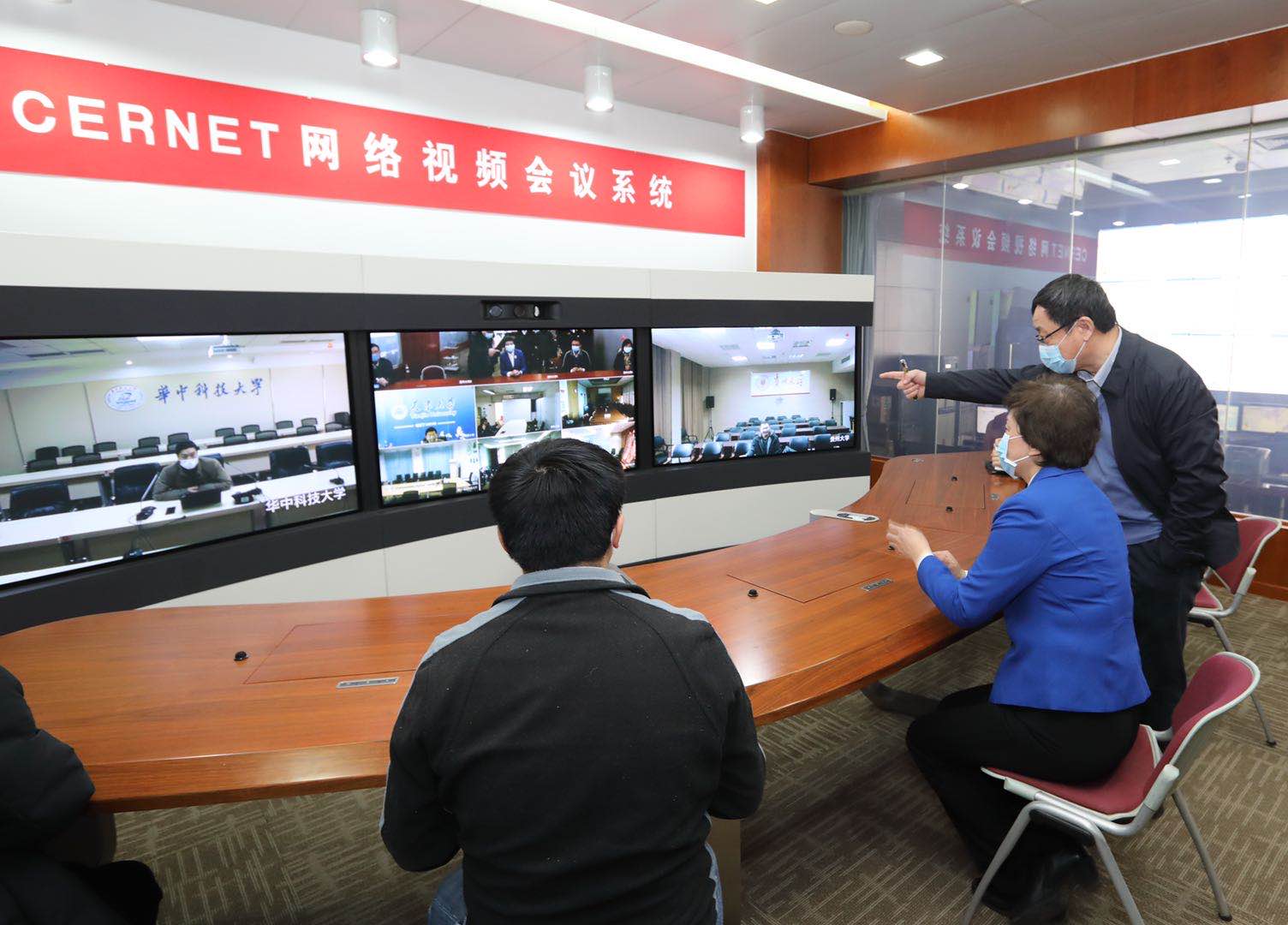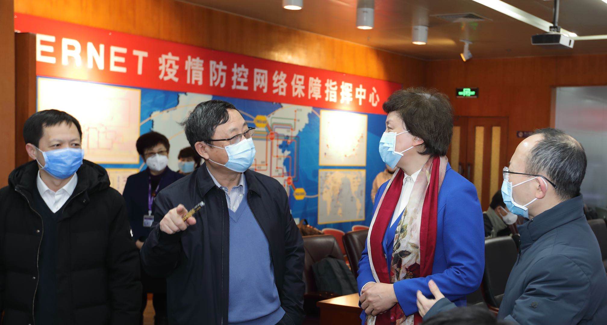 在中國教育和科研計(jì)算機(jī)網(wǎng)CERNET疫情防控網(wǎng)絡(luò)保障指揮中心,陳旭聽取了CERNET網(wǎng)絡(luò)中心主任、清華大學(xué)網(wǎng)絡(luò)研究院院長吳建平院士關(guān)于清華大學(xué)牽頭建設(shè)和運(yùn)行管理的CERNET網(wǎng)絡(luò)中心為全國教育系統(tǒng)的疫情防控工作提供高速、穩(wěn)定、安全、可靠的網(wǎng)絡(luò)服務(wù)和教學(xué)科研信息化保障情況。
