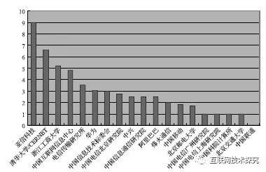 如表6所示,其中網(wǎng)絡(luò)設(shè)備公司有華為、中興、烽火通信;運(yùn)營商有中國電信、中國移動(dòng)、中國聯(lián)通;大學(xué)有清華大學(xué)、北京郵電大學(xué)、北京交通大學(xué)、浙江工商大學(xué);網(wǎng)絡(luò)公司有阿里巴巴、亞信科技;研究機(jī)構(gòu)有電信傳輸研究所、中國信息通信研究院、中國科院計(jì)算所;網(wǎng)絡(luò)資源注冊(cè)機(jī)構(gòu)有中國互聯(lián)網(wǎng)信息中心;政府機(jī)構(gòu)有中國信息技術(shù)標(biāo)委會(huì)。中國發(fā)表RFC數(shù)量以及平均RFC引用數(shù)量的分布如圖1和圖2所示。