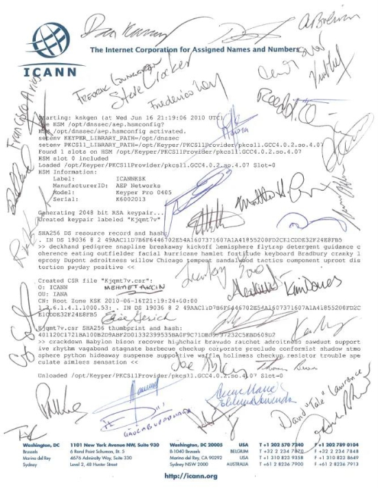 后來,有人提出:既然是可信任的代表,為什么還需要證明是可信任的?而且,密鑰拿來拿去,也容易丟失。自此以后,ICANN改了規(guī)則,只需要持有者發(fā)送承諾函件表示密鑰的安全和完整即可。
