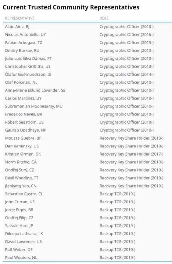 從互聯(lián)網(wǎng)數(shù)字分配機構(gòu)IANA的網(wǎng)站上查到,當前TCRs已從2010年的21位更新至30位,但據(jù)介紹,真正持有密鑰的是21位,其他9位作為備選密鑰持有人。TCRs也有自己的更新機制,比如早期互聯(lián)網(wǎng)共同發(fā)明人Vint Cerf博士就是其中一位TCRs,參與多次密鑰生成儀式,后來因時間問題,即不能保證出席足夠的簽署儀式而退出,從備選TCRs中進行替補。